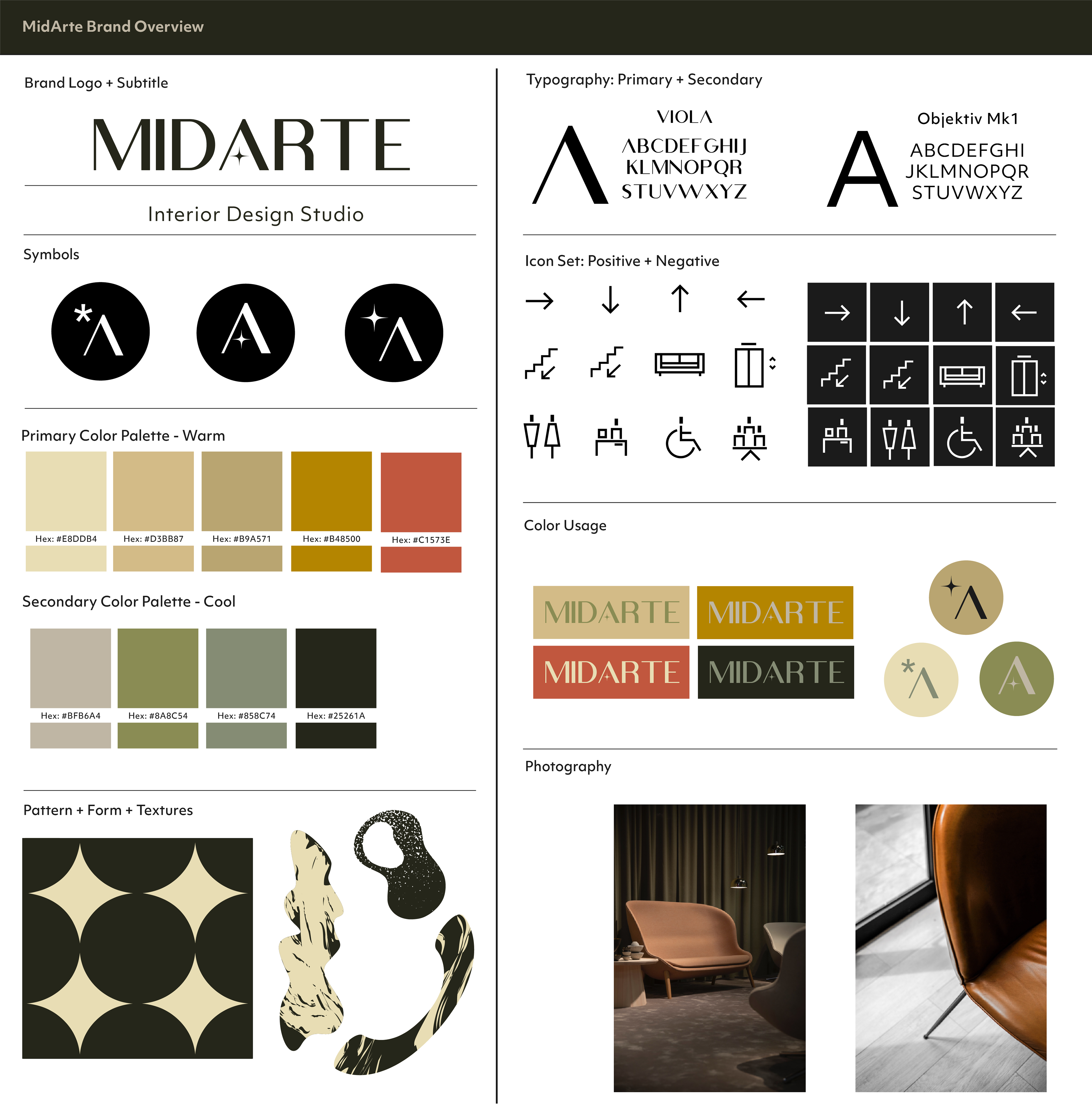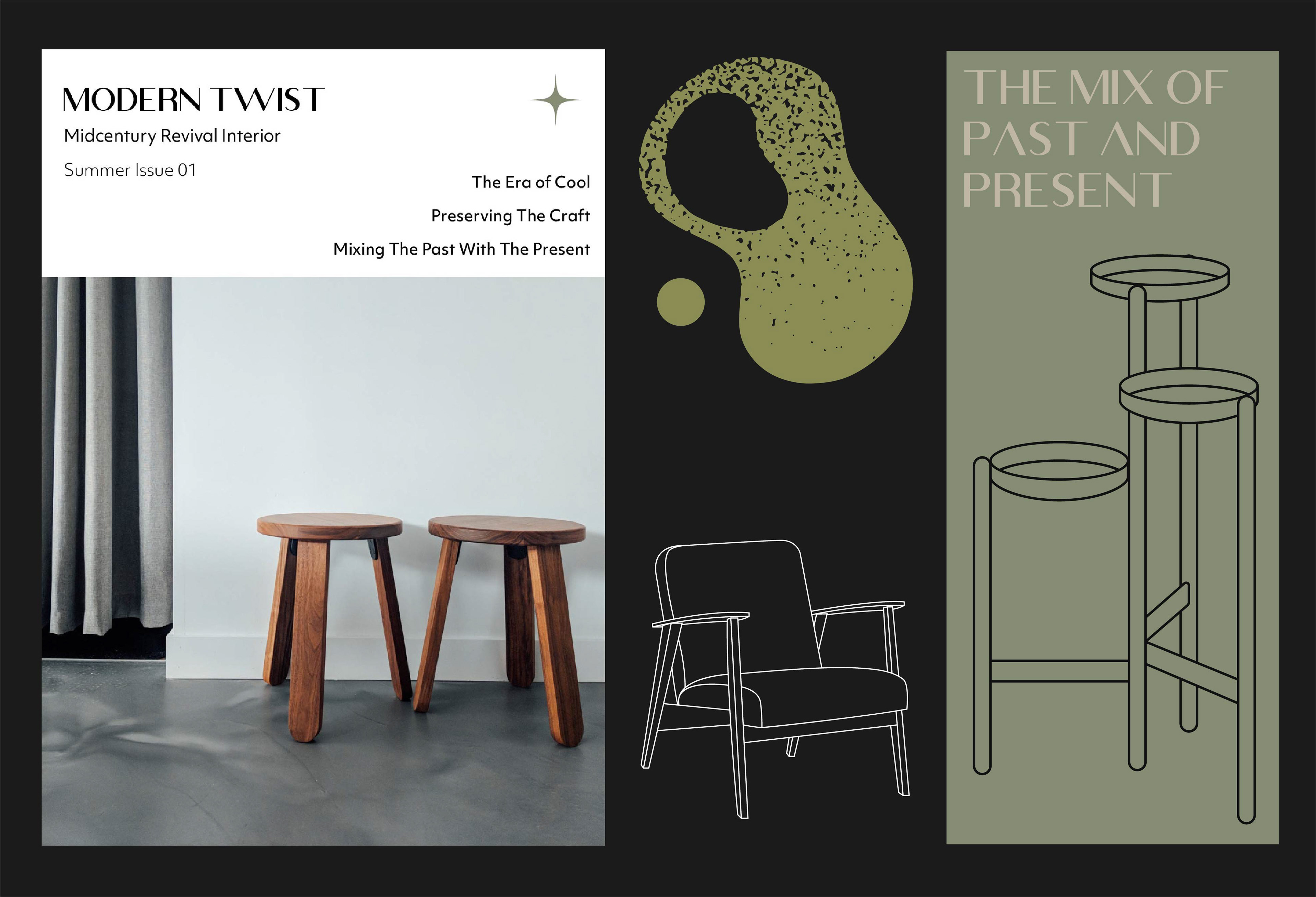 The aim was to design an environmental space that reflects the brand identity of MidArte, an interior design studio specializing in Mid-Century furniture and decor.